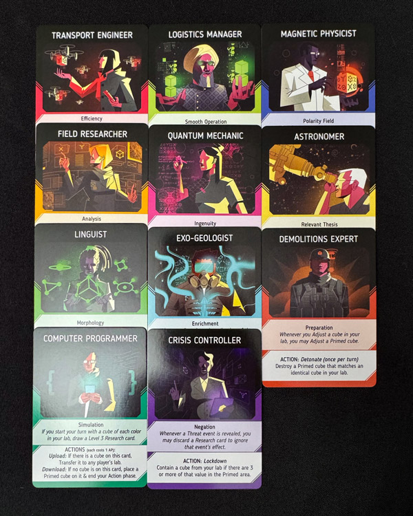 Players will get asymmetric character abilities that will help them coordinate with other players. For example, the player who is the Computer Programmer will get a “level 3” research card if they start their turn with a cube of each color on their player board. (Research cards can be very handy… almost so handy that using them feels like cheating sometimes.) The Computer Programmer can also take a special action: place a cube on their character card for later transfer to another player’s board.