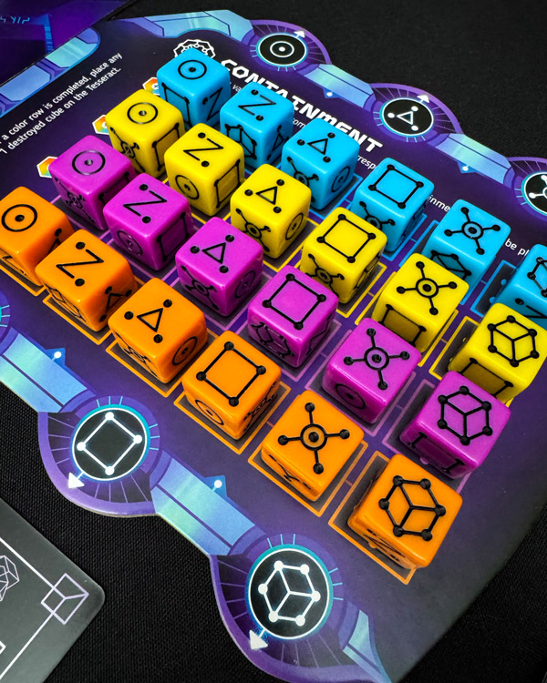 After each player’s turn, the lowest die on the cube will be rolled to see which slot it will reside in beside the containment board in the “primed area.” If three of the same value dice accumulate, a “breach” has occurred. At 7 breaches, the Tesseract explodes! Well not literally, but you do literally lose.