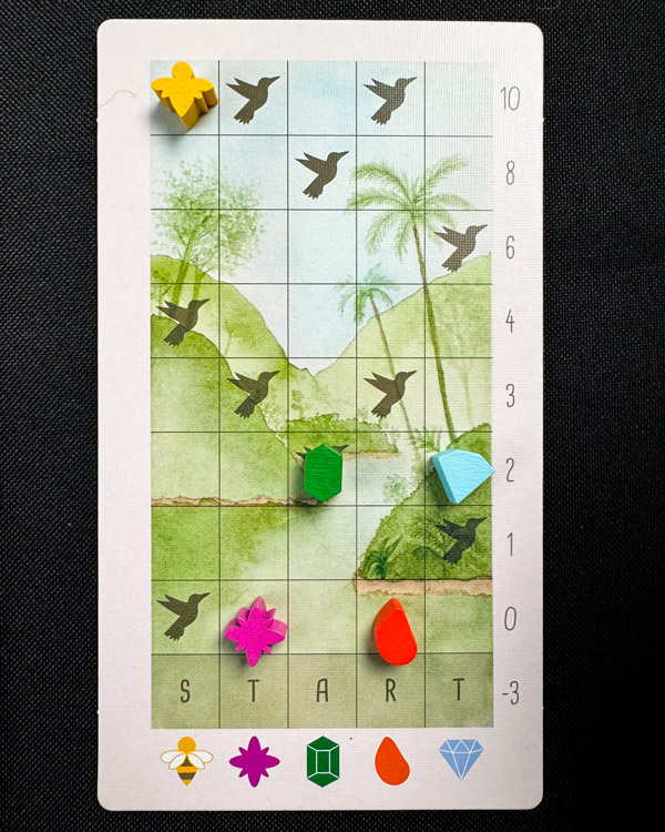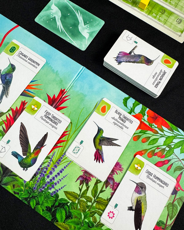 Hummingbird cards provide various abilities when used on player mats, and when they fly back to the main hummingbird board